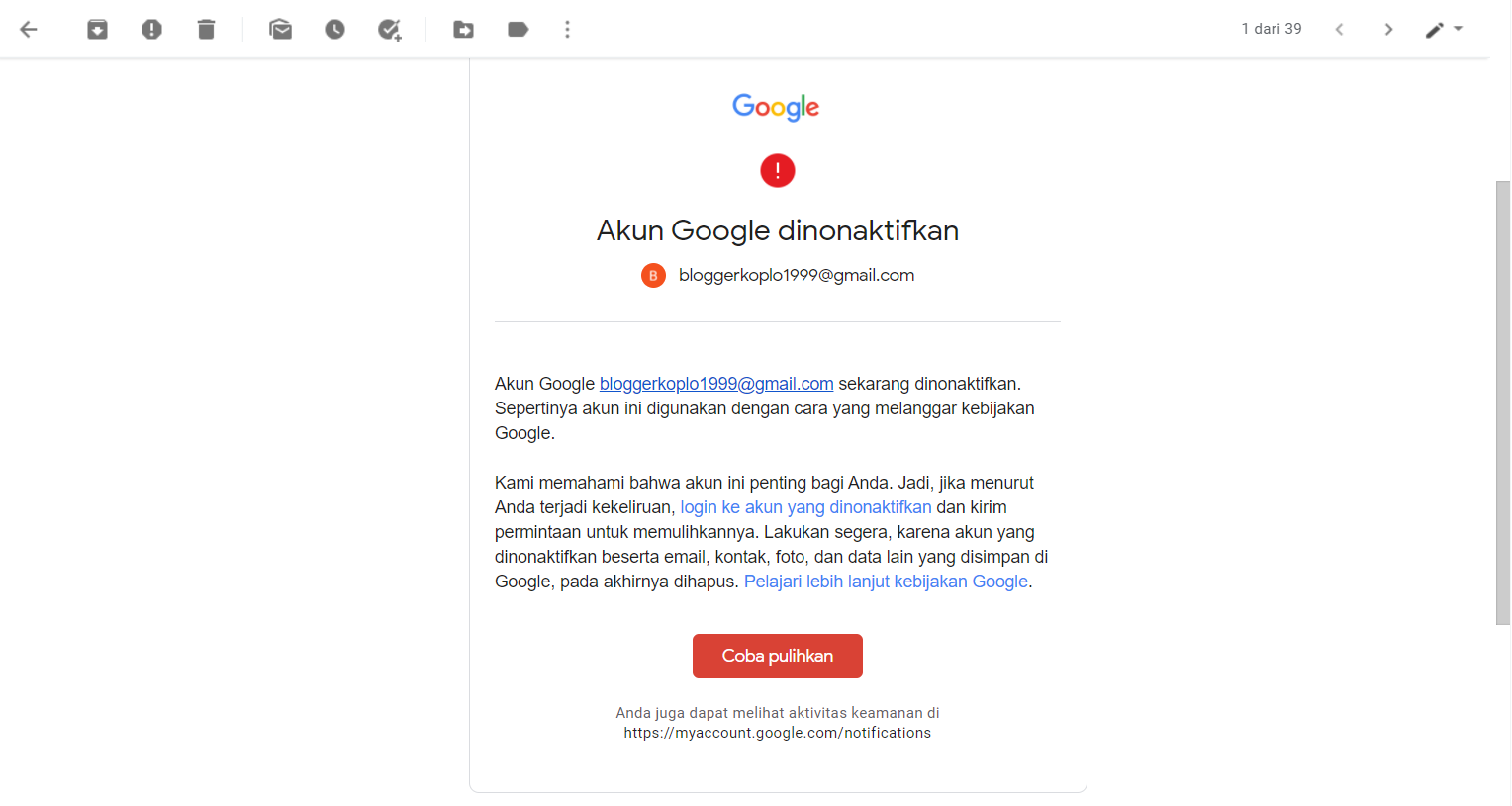 Menggunakan Link Pemulihan yang disajikan google.